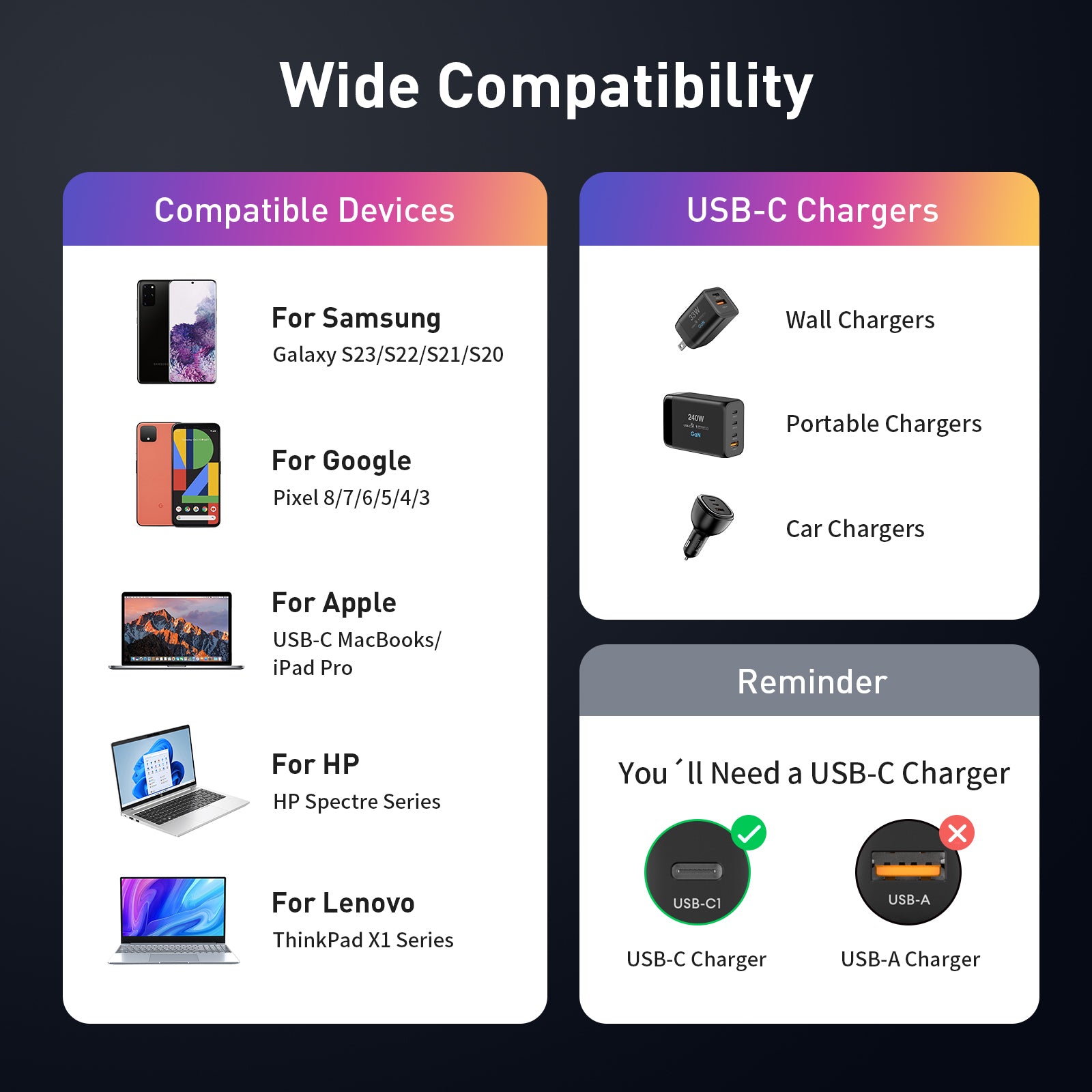 Universal Compatibility: Say goodbye to compatibility woes. Our USB-C to USB-C cable works flawlessly with a wide range of devices, including laptops, tablets, smartphones, and more. Whether you're connecting to your MacBook, iPad Pro, Samsung Galaxy device, or any other USB-C enabled device, this cable has you covered.